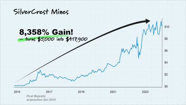 In 2024, Silvercrest Metals announced it was being acquired by Coeur Mining for $10.77/share. The deal was finalized in February of this year – giving my GP10X members an 8,358% gain.