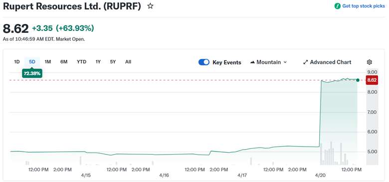 Today, the stock jumped 60% to reflect the bid from Agnico Eagle. I don’t recommend buying shares at this price. If for some reason, the deal falls through, you might be able to scoop up shares later for a discount, but please do not buy Rupert today after this big price spike.