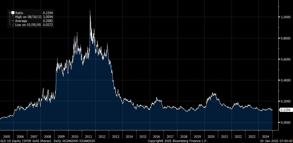 Despite the ongoing stealth Gold bull market, few are positioned for it. In 2011, the last major Gold peak, the GLD ETF held as much investor capital as the popular S&P 500 broad equity market (SPY) ETF. Now the ratio sits at just 0.1194%. Investors need to shift their asset allocation 8.3X to gold over equities to match the peak in 20211. We surely have a long way to go in the Gold bull market.