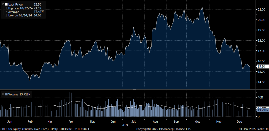 And industry bellwether Barrick Gold fell 14% in 2024.