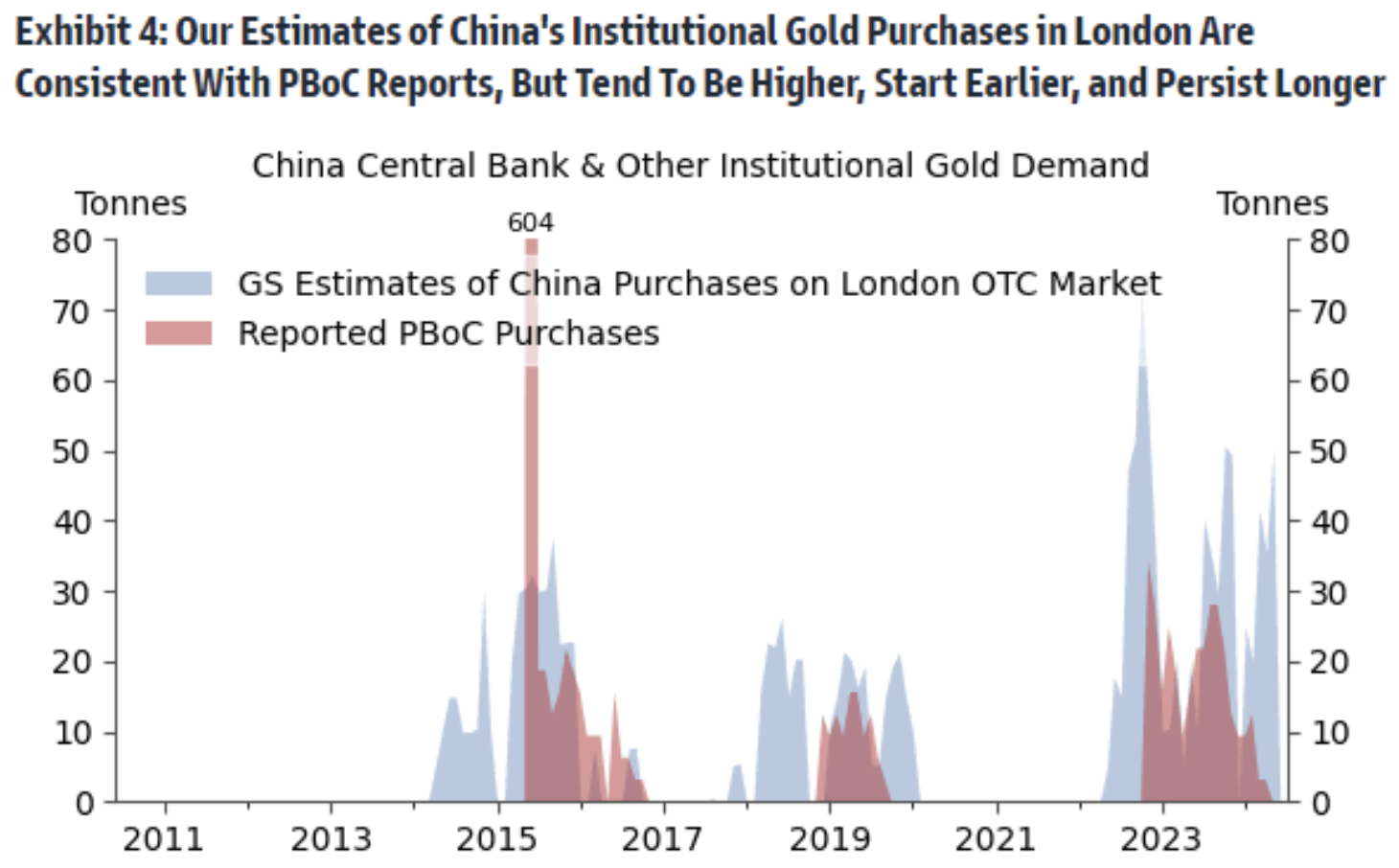 Goldman said, “Our estimates of China’s Institutional Gold Purchases in London are consistent with PBoC reports, but tend to be higher, start earlier and persist longer.”
