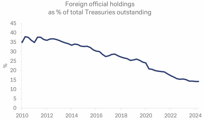 Foreign holdings of US treasury debt have declined from 37% in 2010 to 15% now. China, Russia, and Japan have decided they are not being compensated for inflation and loss of purchasing power due to endless US spending. Central Banks around the world are selling their dollar denominated US treasuries and are buying real assets like Gold. Gold has been a store of value for 1,000’s of years. Gold holds up much better than US dollar denominated paper assets when a Country faces an overspending crisis like the one the US is in now.