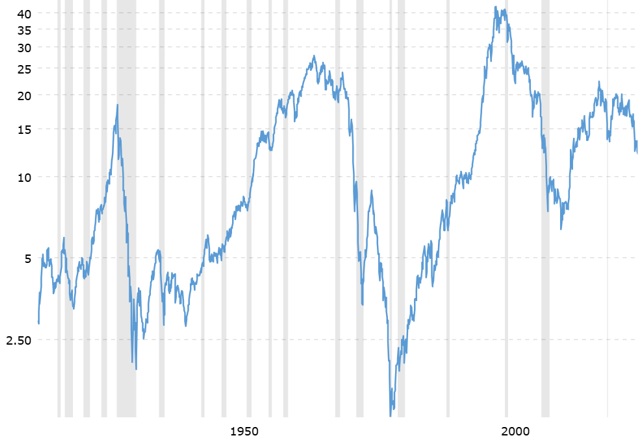 So if you divide the price of gold into the Dow Jones Industrial Average, you get a number that separates out dollar movements, and it shows you the relative movements between gold and the Dow.