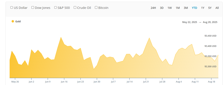 If you recall, for most of this past summer we saw gold go nowhere. From the end of May through the middle of August, gold mostly traded in a narrow range between $3,300 and $3,450.
