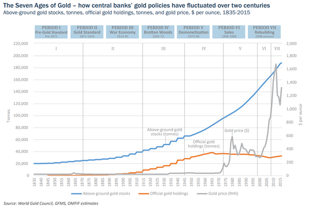 You can see in this chart that official gold holdings fell, represented by the orange line sloping downward starting in the mid-late 1960s and continuing through the 2000s.