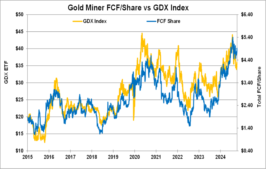 The study shows that the GDX should be trading at $42.55 per share with $4.92/share of FCF. The GDX is only trading for $35.35 per share which is nearly 20% lower than fair value. Large discounts like this don’t occur very often. GDX undervaluation based on FCF/share only reached 20% three times since 2015. Once, in 2015 when the Fed embarked on a rate hiking cycle. And latest was in 2020 when the Fed launched QE4 to deal with the Covid crisis. Both times in 2015, and 2020 Gold stocks and the GDX quickly doubled both times over the next few months. Now in 2025, the GDX is undervalued by 17% based on underlying FCF of $4.92/share.