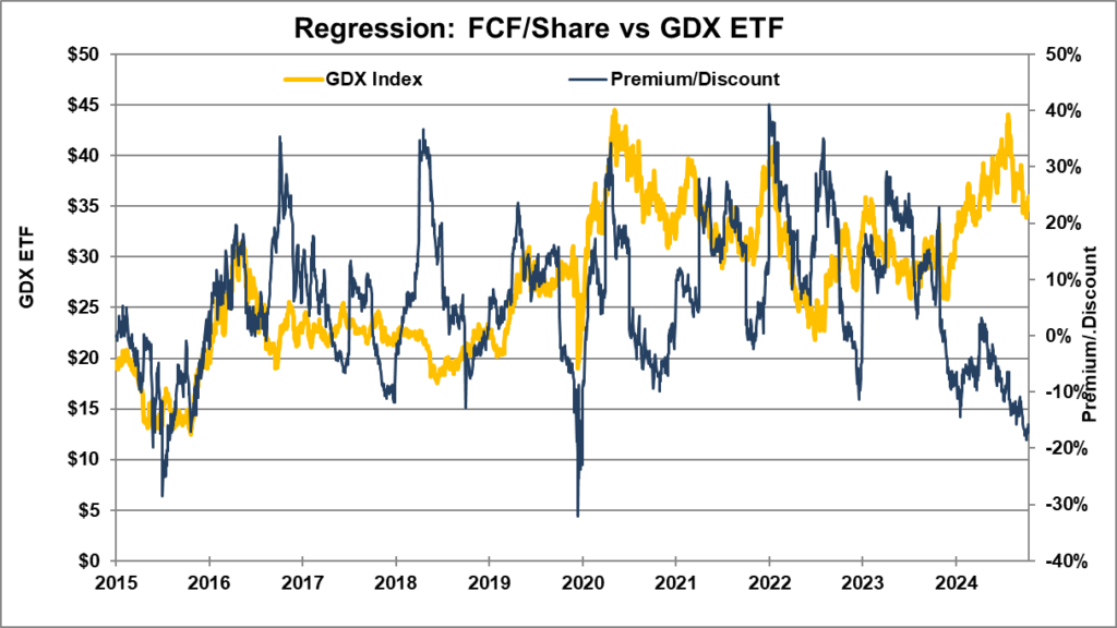 The top 5 Gold Miners last quarter’s annualized production was 21,188K ounces with an average AISC $1,503/oz. At current Gold price of $2,690/oz, the top 5 Miners are generating $25,143 mil FCF. With total 5,114 mil shares outstanding, is worth $4.92 FCF/share. Since the GDX is so highly correlated with FCF/share we can use a regression study to determine where the GDX should be trading at based on $4.92/share of FCF.